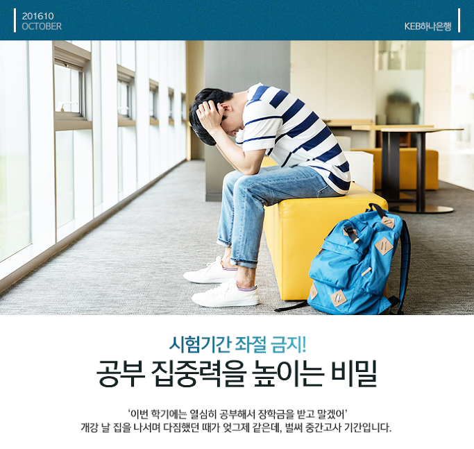 시험기간 공부 집중력 향상 팁! ‘이번 학기에는 열심히 공부해서 장학금을 받고 말겠어.’ 개강 날 집을 나서며 다짐했던 때가 엊그제 같은데, 벌써 중간고사 기간입니다. 시험공부를 하러 도서관에 앉았는데, 책장을 몇 장 넘기지 못하고 꾸벅꾸벅 졸음만 쏟아집니다. 나의 집중력은 어디로 사라진 것일까요? 오늘은 시험기간 공부 집중력을 높일 수 있는 비밀을 소개하겠습니다.