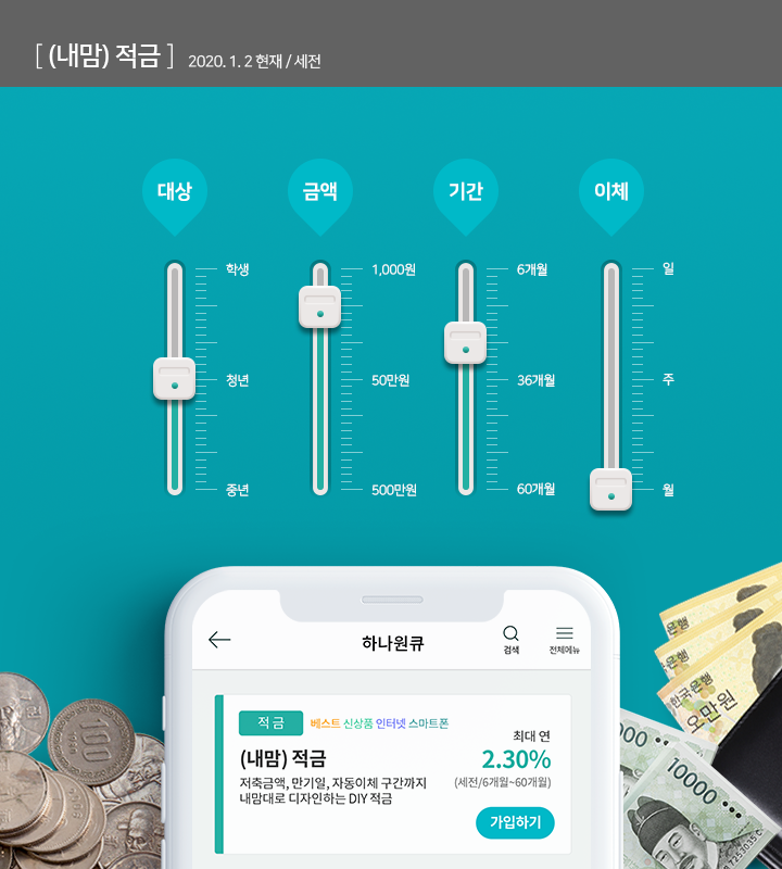 내년이면 엄마 환갑인데… 이번 휴가는 대만으로 먹방여행을 가볼까? 친구들과 여름방학에 유럽으로 배낭여행을 떠나려고 하는데 어떡하지? 이런 생활 속 고민이 있으신 분들에게 내맘대로 DIY 되는 신개념 적금 하나은행 (내맘)적금을 추천해드려요.