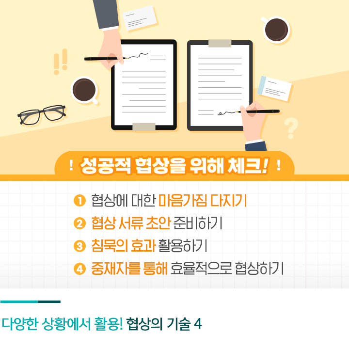 연봉 협상 외에도 직장 생활을 하다 보면 크고 작은 협상을 치러야 하는데요. 이를 대비해 협상의 기본기를 다지는 것이 중요합니다. 그럼 4가지 협상의 기술을 알아볼까요?