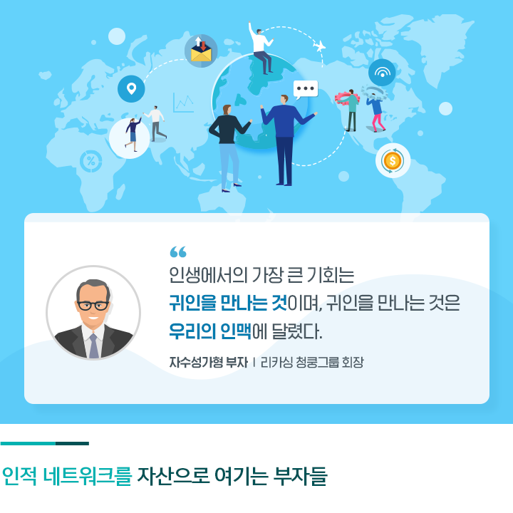 플라스틱 완구업으로 시작해 현재 아시아 최대 부호로 올라선 홍콩의 ‘리카싱’ 청쿵그룹 회장은 대표적인 자수성가형 부자로 꼽히는데요. 리카싱 회장은 "인생에서의 가장 큰 기회는 귀인을 만나는 것이며, 귀인을 만나는 것은 우리의 인맥에 달렸다"고 말했습니다.