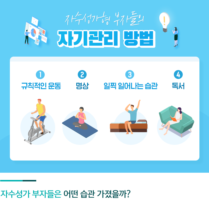 자수성가형 부자들을 가까이에서 지켜본 미국의 자산관리사 ‘토머스 콜리’는 단순히 많이 버는 것 이외에도 그들에게서 공통적으로 나타나는 습관들을 발견했습니다. 자수성가형 부자의 85%는 건강을 유지하는 것이 재정적인 성공에 매우 중요하다고 생각했는데요. 매일 30분 이상 규칙적으로 하는 유산소 운동은 심장과 폐를 튼튼하게 할 뿐만 아니라 뇌세포를 새로 생성하는 효과가 있습니다. 부자들은 명상도 즐겨했는데요. 머릿속을 정리하고 냉철함을 유지하는 효과가 있습니다. 미국의 시사주간지 타임지에서도 명상이 기억력을 강화하고 육체적, 정신적인 에너지를 주는 활동이라고 소개한 바 있죠.