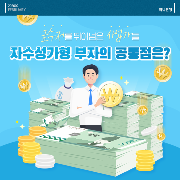 최근 급성장한 IT산업을 통해 성공한 사업가들이 많아, 월급쟁이인 나와 자수성가형 부자는 먼 얘기라고 생각할 수도 있는데요. 가진 것 없이 시작해 인생을 바꾼 새로운 자수성가형 부자들은 어떤 특별한 습관을 갖고 있는 걸까요? 오늘 하나은행과 함께 알아보겠습니다.