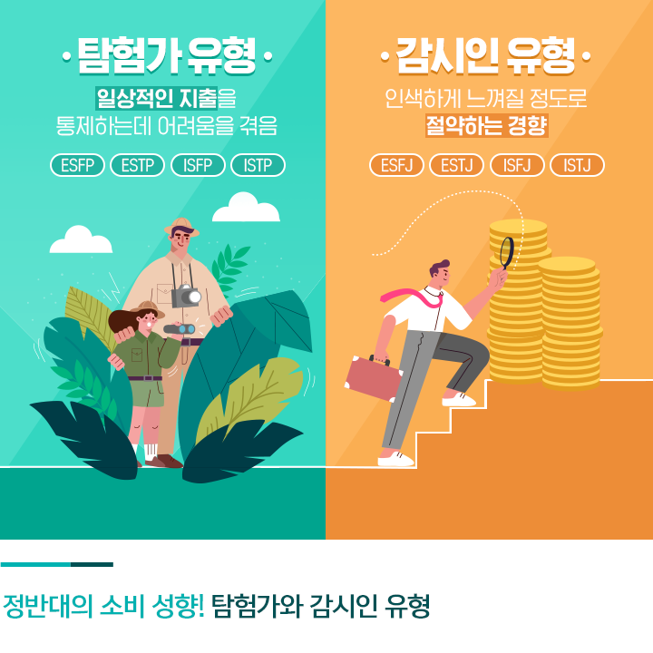 탐험가 유형은 매달 저축 금액과 고정 지출을 엄격하게 정한 뒤, 정해진 예산 안에서 현금을 인출해 사용하는 방법을 택하는 것이 좋습니다. ESFP와 ESTP 등 외향적인 성향의 사람들은 본인들이 파티나 모임에서 제외될 수 있다는 두려움 때문에 사교 비용을 무리해서 높게 유지하는 경우가 적지 않은데요. 어렵겠지만 꼭 필요한 모임만 선별적으로 유지하는 것이 장기적인 재정 상황에 크게 도움이 됩니다.