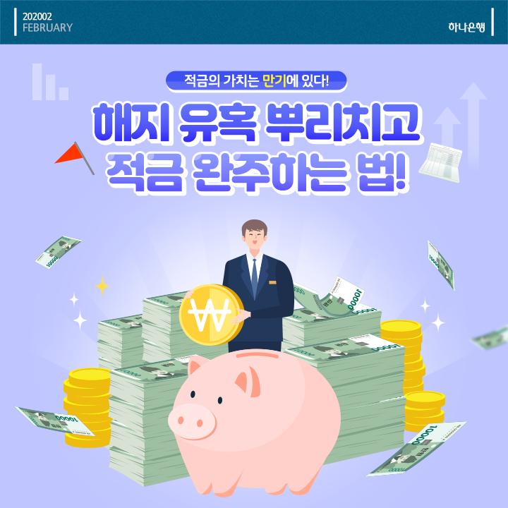 새해를 맞아 가입했던 적금을 벌써부터 깨고 싶은 유혹을 느끼는 분들도 있을 텐데요. 오늘 소개해드린 내용을 바탕으로 다시 한번 의지를 다잡아 보시는 건 어떨까요? 마라톤과 같은 적금 완주에 성공하시기를 하나은행이 함께 응원하겠습니다.
