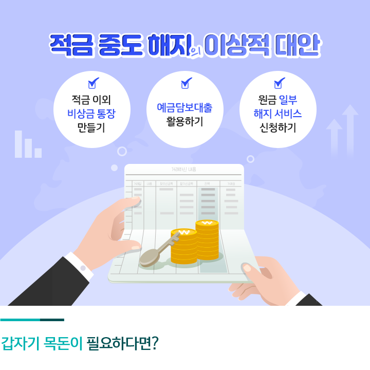 갑자기 목돈이 필요한 상황에서는 적금을 유지해야 하는 목적의식도 희미해집니다. 이런 상황을 대비하기 위한 가장 이상적인 대안은 적금 이외에 비상금 통장을 따로 마련해두는 것인데요. 전문가들은 3개월 치 월급 정도를 비상금으로 예치해 두는 것을 추천합니다. 이직이나 휴직 등으로 수입이 중단되거나, 사고 등의 상황으로 급전이 필요할 때를 대비하기 위해서죠.