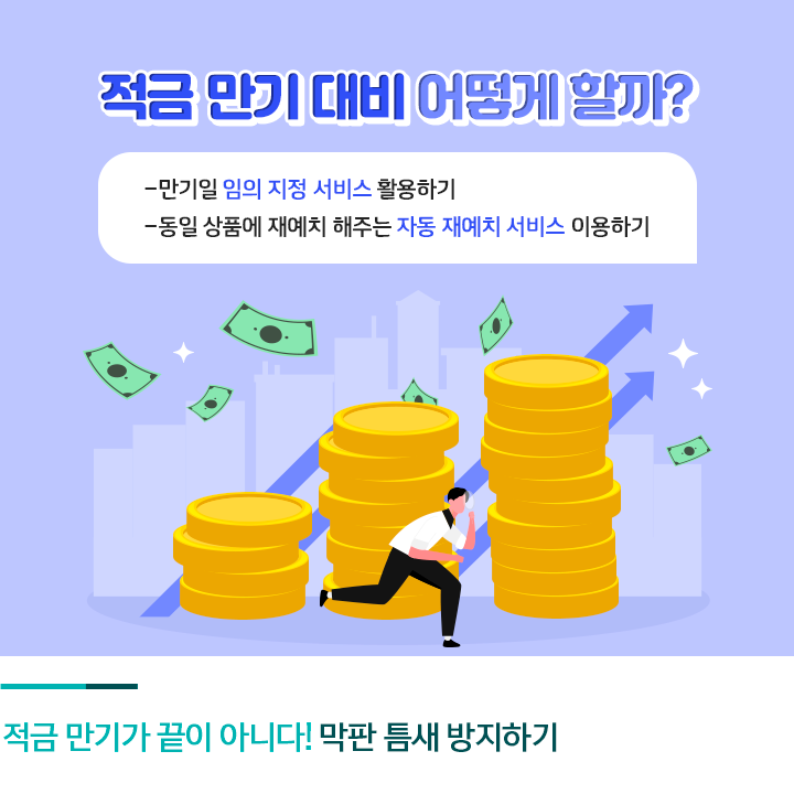가입기간이 짧은 적금은 만기가 도래할 때마다 새로 관리하는 것이 번거로울 수 있는데요. 재예치를 하지 않고 그대로 둘 경우 약정 금리보다 낮은 금리를 받아 상대적으로 손해를 볼 수 있습니다. 따라서 만기 이후 자동으로 동일 상품에 재예치해주는 자동 재예치 서비스를 미리 신청해 두는 것이 좋습니다.