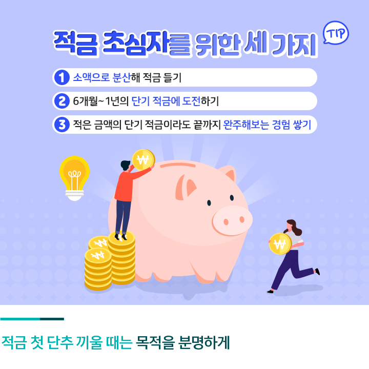 중요한 것은 성취의 경험입니다. 적은 금액의 6개월 단기 적금이라도 끝까지 완주해보는 것이 중요합니다. 6개월~1년 적금을 먼저 시도하고, 성공한 이후에는 2~3년의 적금을 유지하는 습관을 형성해보는 것은 어떨까요? 목표했던 자금이 차곡차곡 쌓여가고, 만기에 받은 금액으로 목적을 이루는 경험들이 쌓이면 만기를 달성하는 것을 넘어 적금의 개수와 목표 금액을 더 늘리는 것도 가능해집니다.
