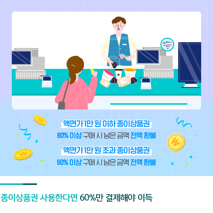 종이상품권을 사용하는 경우에는 최소 사용 금액인 60%까지만 사용하고 남은 금액은 현금으로 돌려받는 것이 가장 유리한 선택입니다. 통상 액면가가 1만 원 이하인 종이상품권은 80% 이상 구매할 때, 액면가가 1만 원 초과인 종이상품권은 60% 이상 구매할 때, 잔액을 현금으로 환불해 줍니다. 예컨대 10만 원짜리 종이상품권을 3% 할인받아 9만 7,000원에 구매한 후 6만 원만 사용하고 4만 원을 돌려받으면, 6만 원짜리 상품을 5%를 할인받아 구매한 셈이 됩니다.