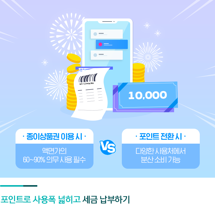 백화점 상품권 등을 신용카드 포인트로 전환할 경우 활용도는 더욱 다양해집니다. 일부 카드사에서는 포인트로 카드대금을 납부하거나 국세청 세금을 납부할 수 있도록 해주는데요. 신용카드로 상품권을 구매하면 2~3% 할인된 가격으로 상품권을 구매할 수 있고 카드 포인트도 받을 수 있습니다. 이렇게 구매한 상품권을 다시 포인트로 전환하면 할인 가격 이상의 이익을 보게 됩니다. 재산세, 주민세, 자동차세, 상하수도 요금, 지방세, 과태료도 신용카드 포인트로 납부가 가능하기 때문이죠. 현금으로 지출할 금액을 카드 포인트로 사용한다면 3%가량을 아끼게 되는 셈입니다.