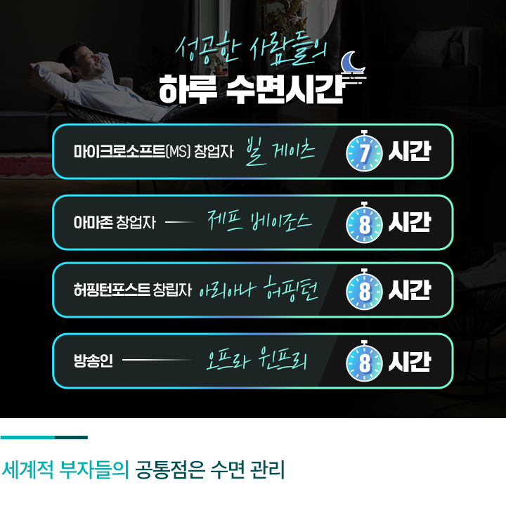 칼럼니스트 ‘벤자민 스폴(Benjamin Spall)’이 5년간 각 분야에서 정상에 오른 30여 명의 인물들을 인터뷰한 결과를 보면 수면 습관에서 여러 가지 공통점을 발견할 수 있습니다. 성공한 사람의 하루 평균 수면시간은 7시간 29분이었고 아침 일찍부터 시작하여 더 큰 에너지, 집중력과 평온을 얻었다고 하는데요. 우리가 잘 아는 세계적인 재벌들 역시 충분한 수면의 중요성을 강조하고 있습니다.