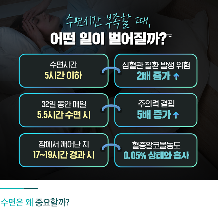 관련 연구에 따르면, 수면시간이 5시간 이하면 심혈관 질환 발생 위험이 2배 증가하고, 32일 동안 매일 5.5시간 수면 시 주의력 결핍이 5배 증가하는 것으로 나타나기도 했습니다. 또 잠에서 깨어난 지 17~19시간이 지나면 혈중알코올농도 0.05%인 상태와 비슷해진다고 하는데요. 늦은 시간까지 일을 하는 경우 면허정지 수준으로 인지적 기능이 손상된 상태가 된다고 할 수 있죠.