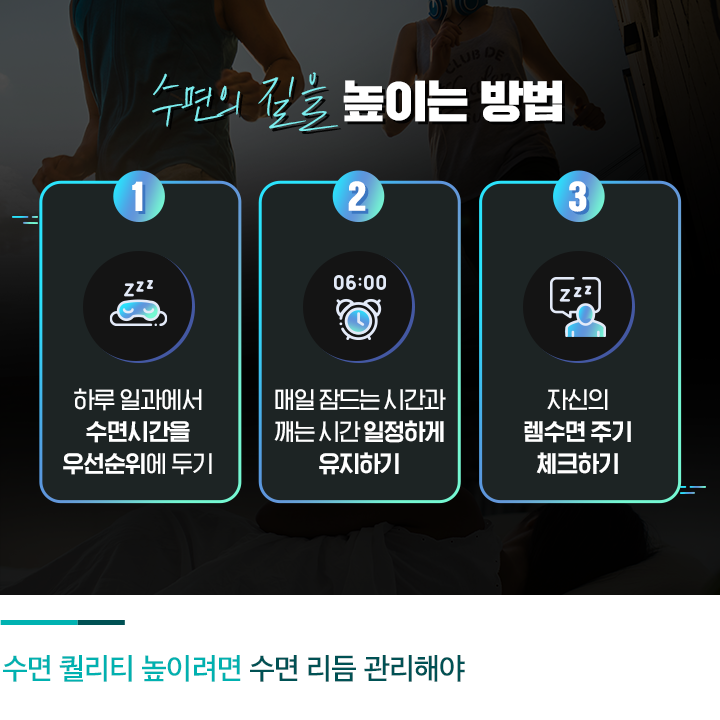그럼 수면의 질을 높이는 방법은 무엇일까요? 하루 일과에서 수면시간을 우선시하는 사고를 갖는 것이 첫 번째인데요. 하루 일과 중 수면시간을 먼저 확보한 후, 남는 시간에 나머지 일정을 배치해야 합니다. 일할 시간이 부족하다면 잠을 줄이기 보다는 생활습관을 간소화하고 생산성을 높여, 새는 시간을 줄이는 게 좋습니다. 특히 취미나 친목 활동에 쏟는 시간을 줄이더라도, 고정된 수면시간을 유지할 수 있도록 노력해야 한다는 것이죠.