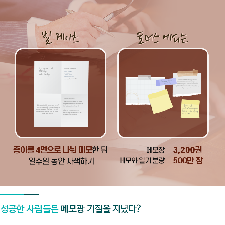 아무리 사소한 메모라도 차곡차곡 쌓아가다 보면 그 어디에서도 구할 수 없는 아이디어 노트가 될 수 있고, 내 인생을 성공의 길로 이끌어 줄 로드맵이 될 수도 있습니다. 오늘부터 여러분만의 메모하는 습관을 가져 보시는 건 어떨까요?