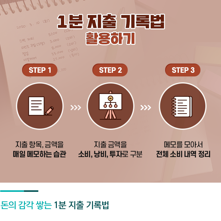 돈을 쓸 때도 메모 습관을 들이는 것은 중요합니다. 제대로 된 가계부를 쓰지 않더라도 간단한 지출 메모만으로 돈에 대한 감각을 익힐 수 있습니다. 방법은 아주 간단한데요. 매일매일 그날의 지출 항목과 지출 금액을 적습니다. 그리고 지출한 돈을 소비와 낭비, 투자 등 세 가지로 구분합니다.