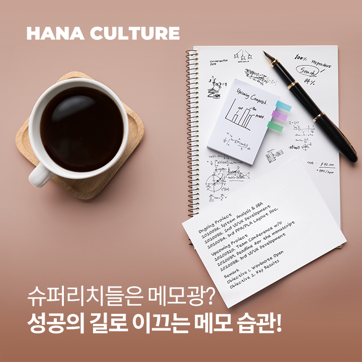 하루하루 바쁘게 살아가다 보면 ‘내가 무엇을 하고 있는지, 또 무엇을 위해 살아가고 있는 것인지’ 종종 헷갈려하며 삶의 방향성을 잃기도 합니다. 누구보다 바쁜 슈퍼리치들 역시 때때로 삶의 방향성이 흔들린 경험을 했다고 하는데요. 방향성을 바로잡고 삶의 계획대로 일상을 이끌어주는 힘을 가진 것이 바로 ‘메모’입니다. 기업 최고경영자(CEO)를 비롯한 성공한 사람들의 상당수가 메모하는 습관을 가지고 있는데요. 오늘은 하나은행 1Q블로그와 함께 성공하는 사람들의 메모의 기술에 대해 알아보겠습니다.