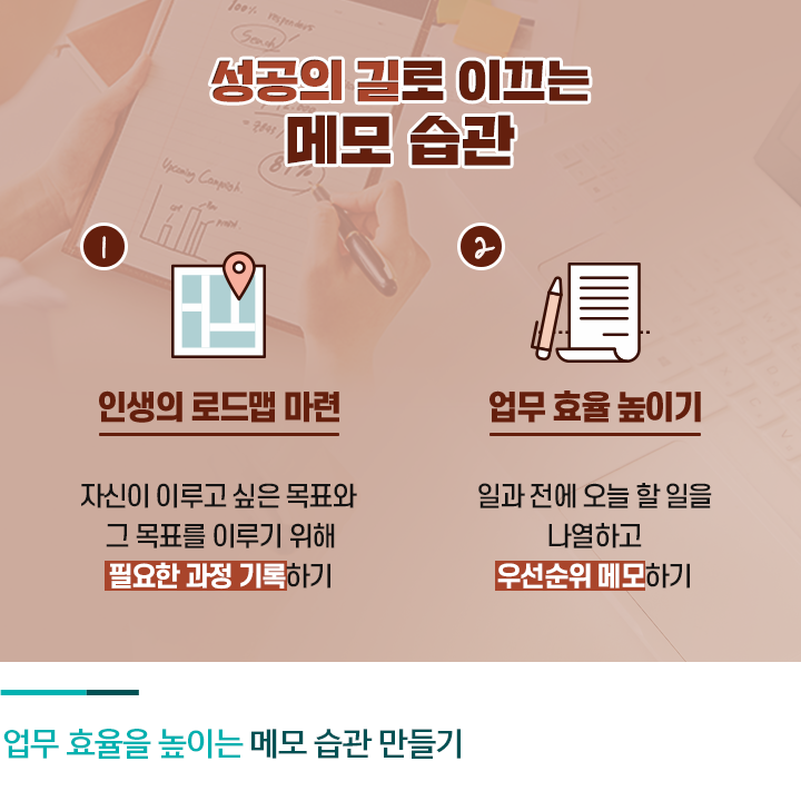 그렇다면 메모하는 습관은 성공에 어떤 식으로 도움이 될까요? 크게 보면 인생의 로드맵을 만들어나갈 수 있습니다. 자신이 이루고 싶은 목표를 기록하고 그 목표를 이루기 위해 필요한 과정을 메모하다 보면 막연하게 머릿속으로 생각만 하는 것과는 전혀 다른 추진력을 얻게 됩니다. 또 장단기 계획에 대한 아이디어가 떠오를 때마다 업데이트할 수 있는데요. 자신의 커리어나 인생의 버킷리스트, 재테크 등 다양한 분야에서 활용할 수 있답니다. 또 눈앞의 업무를 처리할 때도 메모는 큰 도움이 되는데요. 목표와 과정을 메모하면 자연히 업무의 속도가 빨라질 수밖에 없습니다. 메모를 통해 업무의 우선순위를 파악할 수 있고, 메모를 정리하며 미처 처리하지 못한 업무도 꼼꼼히 체크할 수 있기 때문입니다.