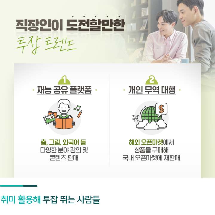 사람이라면 누구나 일을 하며 살아갑니다. ‘피할 수 없으면 즐겨라’라는 말처럼, 즐기면서 일하는 것이야말로 가장 이상적인 삶의 형태가 아닐까요? 자신에게 알맞은 투잡을 선택해 월급 통장뿐 아니라 일상까지도 풍요롭게 만들어보시기 바랍니다.