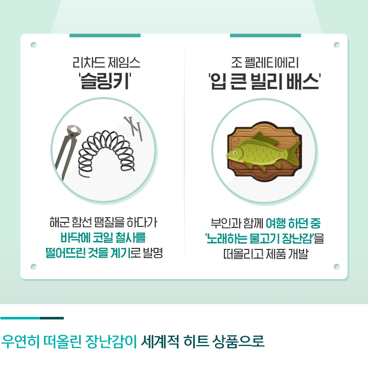 ‘리차드 제임스’가 만든 ‘슬링키’는 90년대에 돌풍을 일으켰던 장난감으로, 아마 많은 분들이 알고 있을 것 같은데요. 계단에서 저절로 내려가는 나선형 스프링 장난감은 우연한 실수로 발명된 장난감입니다. 해군 함선의 기술자였던 제임스는 땜질을 하다가 코일 철사를 떨어뜨렸는데, 바닥에서 코일 끝이 넘어지는 것을 보고 이 장난감을 발명했다고 합니다.