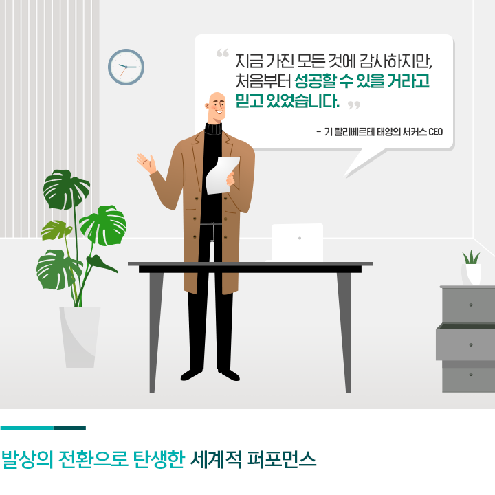 또 세계적인 서커스 공연 ‘태양의 서커스’의 CEO ‘기 랄리베르테’의 성공 스토리도 눈에 띕니다. 그는 길거리에서 먹고 자던 가난한 공연예술가 출신이었다고 합니다. 당시 사람들에게 서커스 공연은 따분한 동물 공연이 주가 되었으며 점점 쇠락하던 시기였으나, 기 랄리베르테는 ‘서커스를 재창조해보자’는 발상의 전환으로 새로운 기획을 시작했는데요. 어찌보면 단순한 아이디어로 시작한 이 기획은 감동적인 스토리와 공연자의 운동능력을 앞세운 퍼포먼스로 자리매김했죠. 현재 기획자인 랄리베르테는 26억 달러(한화 약 3조 1,694억 원)의 억만장자에 올랐습니다.