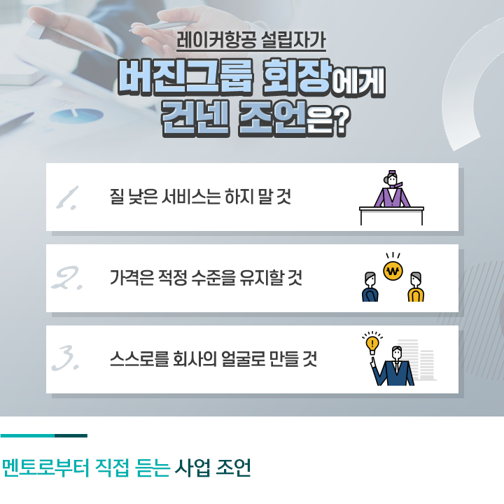 버진그룹 회장 ‘리처드 브랜슨’의 멘토는 영국 항공산업의 전설 ‘프레디 레이커’입니다. 브랜슨은 계열사 중 하나인 ‘버진 애틀랜틱항공’을 처음 설립할 당시, 항공사업 경험이 전혀 없었는데요. 자신의 멘토인 프레디 레이커 덕분에 자신감을 가지고 시작할 수 있었다고 합니다. 레이커는 1960년대 레이커항공을 설립한 뒤, 장거리 노선에 저가 항공 모델을 도입한 첫 번째 인물인데요. 그는 브랜슨에게 질 낮은 서비스는 하지 말고 가격은 적정 수준을 유지하라는 조언을 비롯해 거대 항공사의 갑질에 대응하는 방법까지 상세히 가르쳐줬다고 하네요. 또 브랜든 스스로를 회사의 얼굴로 만들라는 중요한 당부도 전해준 것으로 알려졌습니다.