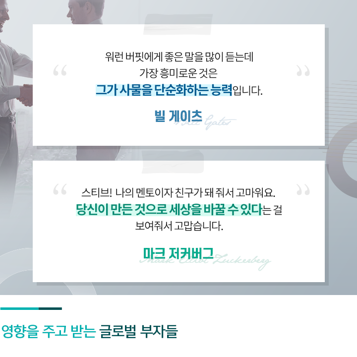 인생을 살아가면서 어떤 사람을 만나느냐에 따라 인생의 방향이 크게 달라지기도 합니다. 좋은 친구와 스승은 한 사람의 인생에 긍정적인 영향을 미치는데요. 현재 최고의 위치에 있는 글로벌 리더와 부자들에게도 그들의 인생에 영향을 미친 멘토와 인맥이 있습니다. 오늘은 하나은행 1Q블로그와 함께 슈퍼리치들의 특별한 인맥에 대해 알아보겠습니다.