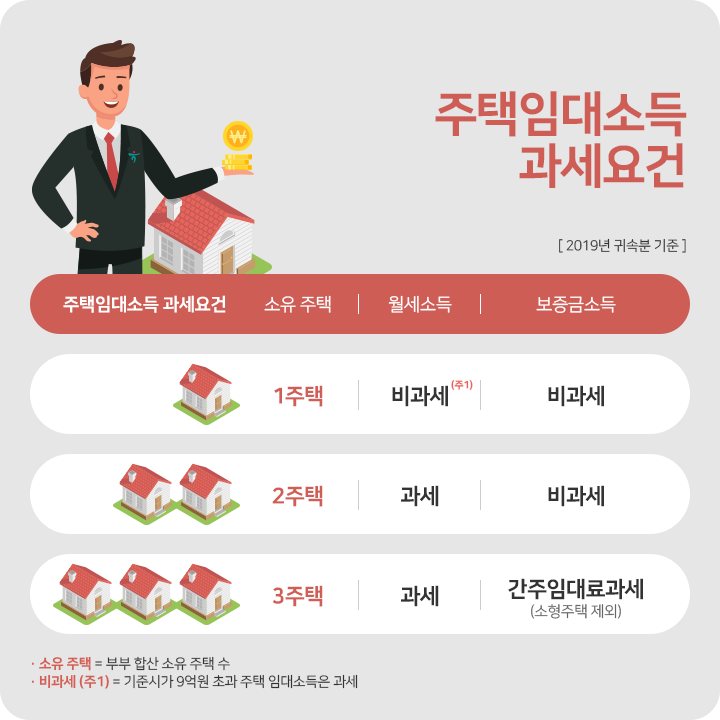 이렇듯 주택임대소득에 대한 소득세 과세는 보유하고 있는 주택 수, 주택의 가액, 임대의 형태(월세/전세) 등에 따라 소득세 과세 여부가 달라집니다.