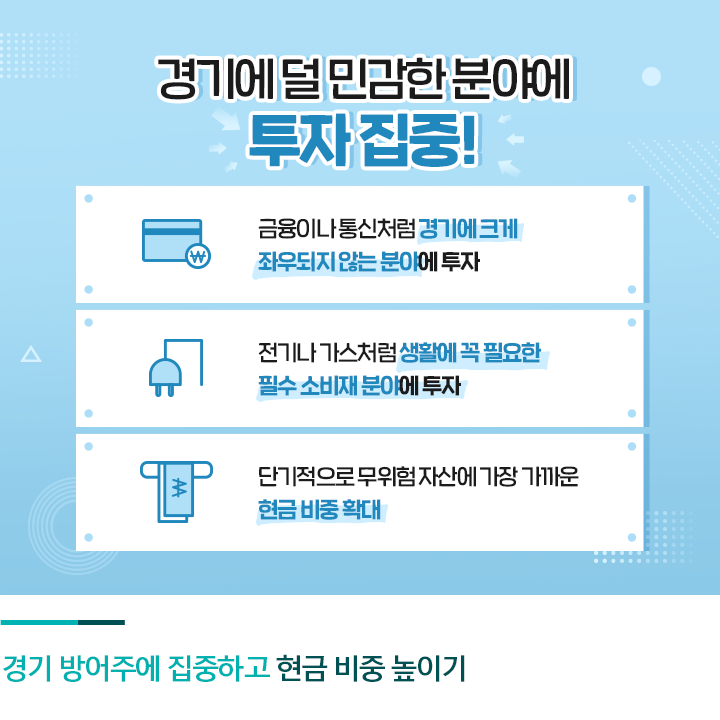 ‘위기는 곧 기회’라는 말은 경기 침체기에도 적용될 수 있는데요. 자신의 투자 전략을 면밀히 점검하는 한편, 단기 차익보다는 꾸준한 배당이나 안정적 이익을 추구해 ‘경기 침체기’를 ‘돈 버는 기회’로 삼는 여러분이 되시기를 응원하겠습니다!
