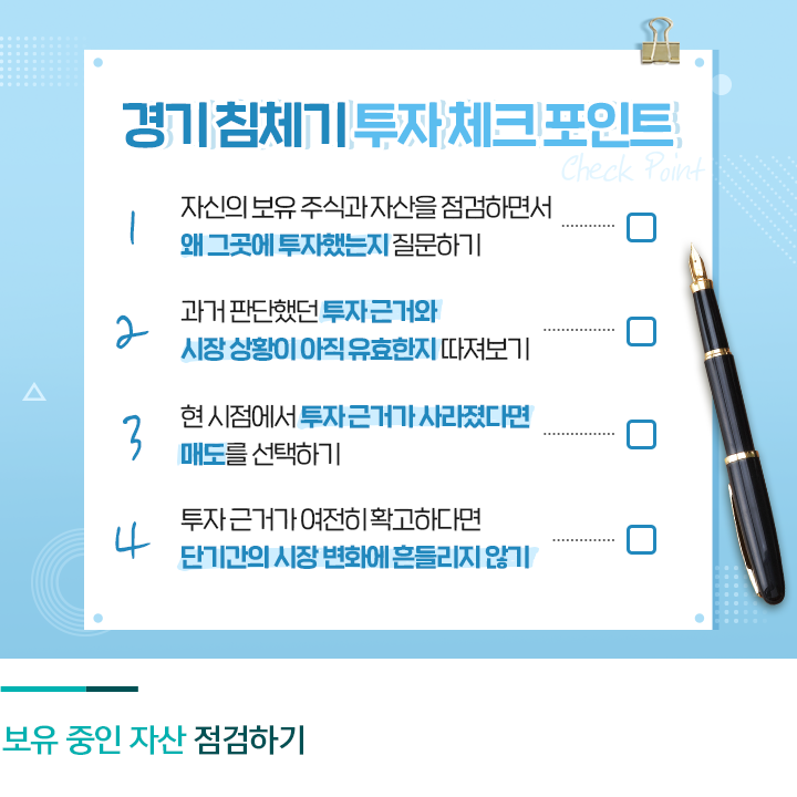 특히 경기가 호황일 때는 자신이 가진 모든 주식이 우량주처럼 보이는데요. 경기 침체기가 시작되면 보유 주식과 자산을 점검하면서 왜 그곳에 투자했는지 스스로 질문해야 합니다. 처음 투자할 당시에 가졌던 계획을 떠올려 보고 그 이유가 아직도 유효한지 생각해볼 필요가 있습니다. 만약 경제 전망이 바뀌면서 투자 상황도 변화했다면 매도를 선택해야 하겠죠. 반면 당시에 가졌던 확신이 경기 침체에도 변하지 않을 만큼 확고하다면 단기간의 시장 변화에 흔들리지 말아야 합니다.