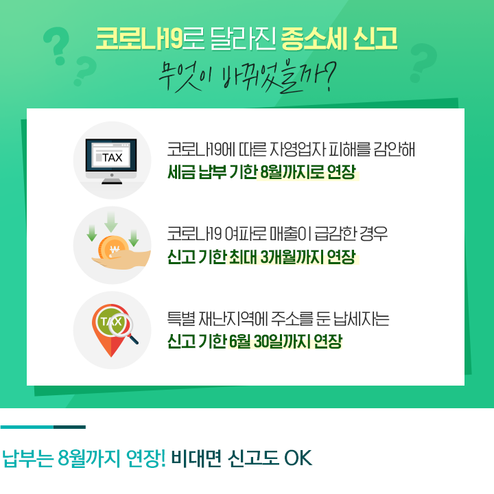코로나19 여파로 매출이 급감한 경우에는 신고 기한을 미룰 수 있습니다. 최대 3개월까지 가능합니다. 대구나 경북 경산, 청도, 봉화 등 특별 재난지역에 주소를 둔 납세자는 신고기한이 6월 30일까지 한 달 직권 연장됩니다. 직권으로 연장된 납세자는 연장에 따른 납세담보를 제공하지 않아도 되고, 신청에 의한 기간 연장도 최대 1억 원까지 납세담보가 면제됩니다.