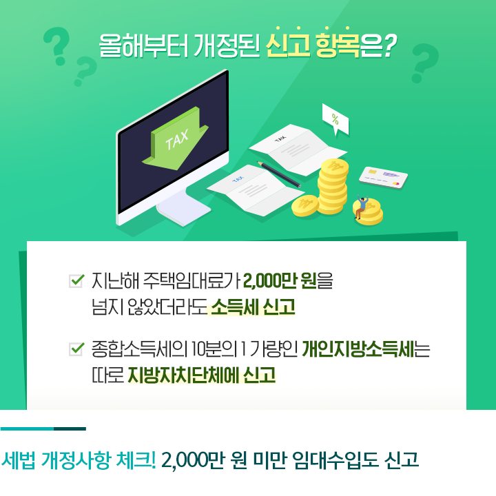 올해부터 개정된 신고 항목들도 잘 살펴봐야 합니다. 먼저 지난해 주택임대료가 2,000만 원을 넘지 않았더라도 소득세를 신고해야 합니다. 2014년부터 2018년 귀속분까지는 비과세 대상이었는데요. 20`9년 귀속분부터는 과세 대상이 됐습니다.