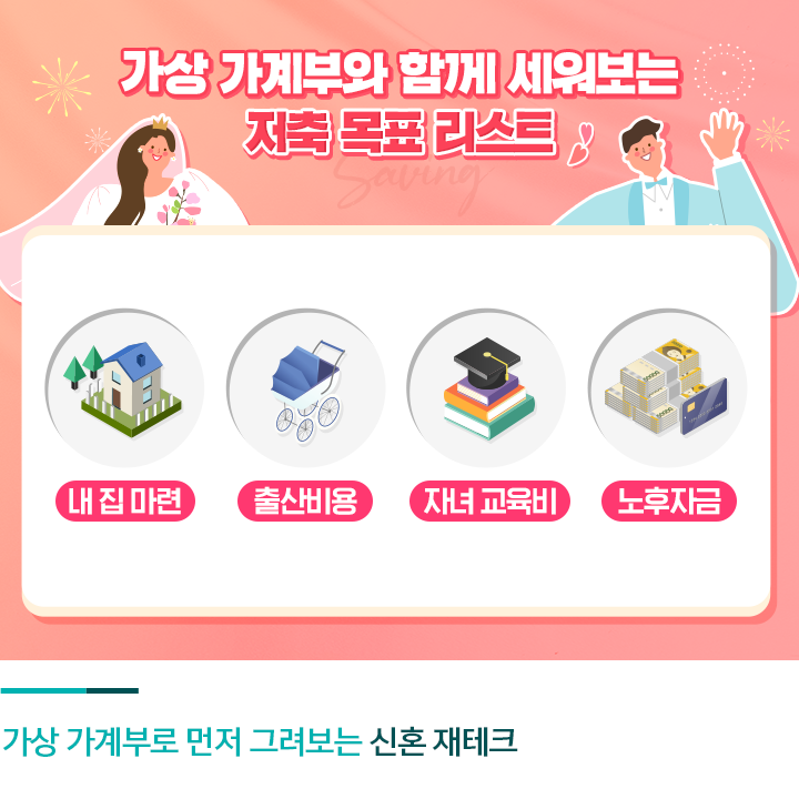 저축 목표를 설정할 때는 장기적인 관점을 가지고 기간별로 세워보면 더 빈틈없이 준비할 수 있습니다. 크게 4가지로 나눠서 생각해볼 수 있는데요. 내 집 마련과 출산비용, 자녀 교육비 그리고 노후자금입니다. 이러한 자금 목적과 시기에 맞춰 단기, 중기, 장기로 나눠 저축 목표를 세우면 체계적인 재테크가 가능합니다. 또한 저축 목표를 달성하기 위해 앞으로 지출을 얼마나, 어떻게 줄여야 할지 머리를 맞대고 이야기 나누는 것도 중요하죠. 이런 방식으로 결혼 전 가상가계부를 함께 작성해보면 결혼 직후부터 계획대로 재테크를 시작할 수 있습니다.