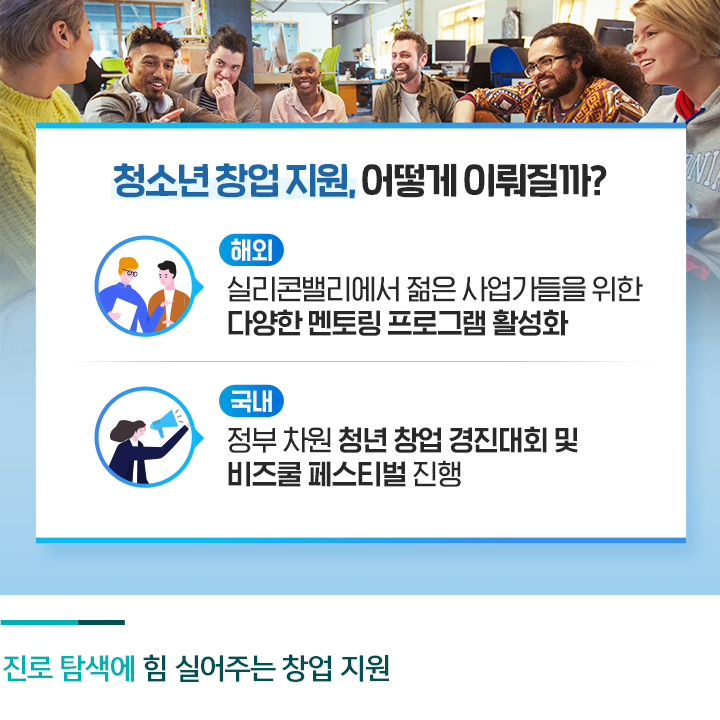 우리나라에도 10대 학생들을 위한 창업 지원책이 나와 있는데요. 정부는 초·중·고등학생부터 대학생·대학원생까지 참여할 수 있는 창업 경진대회를 매년 진행하고 있습니다. 학생들이 3∼7명으로 팀을 구성해 창업을 목표로 아이디어와 기술을 구현해보고, 이를 경쟁하는 대회입니다. 또 중소벤처기업부는 청소년의 모의창업을 지원해 주는 비즈쿨(비즈니스와 학교의 합성어) 페스티벌도 매년 진행해왔는데요. 10대 청소년들이 스타트업에 도전하고 진로를 탐색할 수 있도록 체험의 장을 만들어주자는 취지입니다.