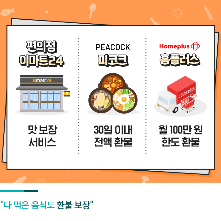 유통업계는 환불 마케팅이 효과를 보이자 그 범위를 확대했습니다. 이마트는 가정간편식(HMR) 브랜드인 피코크 제품을 구입한 소비자가 맛이나 품질에 만족하지 못하면 30일 이내에 전액 환불해 주고 있는데요. 홈플러스 역시 채소나 우유 등 신선식품을 월 100만 원 한도에서 조건 없이 환불해 주는 정책을 운용하고 있습니다.