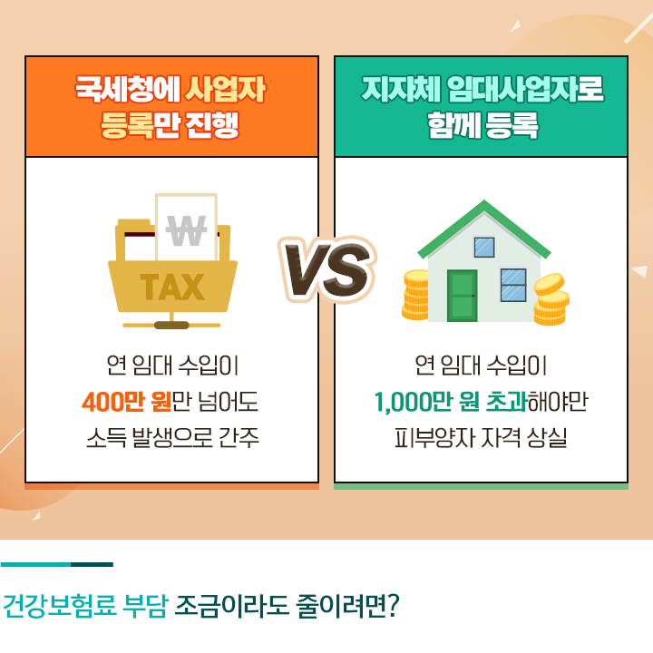 임대소득에 대한 건강보험료 부담을 조금이라도 줄이려면 국세청 사업자 등록과 함께 지자체에 별도로 임대사업자 등록을 하는 것이 유리합니다. 국세청에 사업자 등록만 한 경우에는 연간 임대 수입이 400만 원만 넘어도 소득이 발생한 것으로 간주되어 건강보험 피부양자 자격을 상실하는데요.