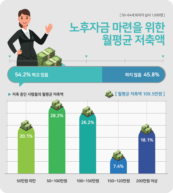 노후자금으로 얼마가 있어야 충분한 걸까? 100년 행복연구센터가 퇴직자들에게 물어본 결과 충분한 노후자금은 평균 6억 8백만원인 것으로 조사됐습니다. 이런 상황에서 퇴직자 2명 중 1명(54.2%)은 지금도 노후준비를 위한 저축을 이어가고 있습니다. 이 때 평균 저축액은 월 109.5만원이었습니다. 노후준비하는 퇴직자 5명 중 1명(20.1%)은 월 50만원 미만을 저축했습니다. 또다른 5명중 1명(18.1%)은 반대로 월 200만원 이상이나 저축했습니다. 그렇게 개인의 상황에 따라 노후준비 금액은 다양했습니다.