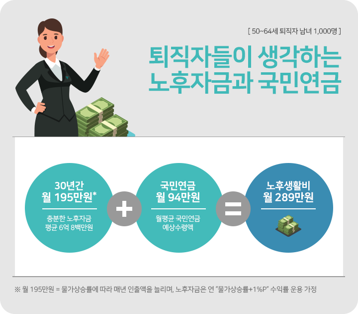 50대 이상 퇴직자들이 평균적으로 바라는 노후자금, 6억 8백만원. 그 정도 자금이면 당장 월 195만원을 30년동안 꺼내 쓸 수 있다는 계산입니다. 이후 매년 물가상승률만큼 늘려 인출하고, 노후자금은 물가보다 1%p 정도 높은 수익률로 운용하는 상황을 가정한 결과입니다. 여기에 퇴직자들의 국민연금 예상액 월 94만원을 더하면 생활비 월 289만원 정도가 확보됩니다. 이렇게 역산을 해보니, 퇴직자들은 생활비 월 300만원 정도 확보되면 어느정도 안심할 만하다고 보는 게 아닐까 합니다.