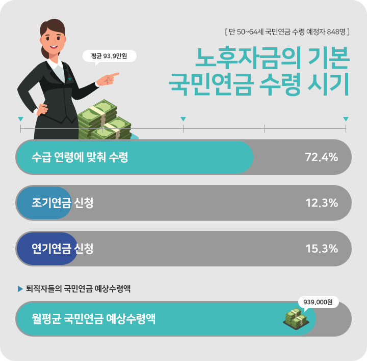 노후준비라면 빠질 수 없는 게 국민연금일 텐데요. 퇴직자들은 국민연금으로 평균 93.9만원을 받을 것이라 예상했습니다. 언제부터 받기 시작할 것이냐라는 질문에는 퇴직자 대부분(72.4%)은 노령연금 수급연령에 맞춰 받겠다고 응답했습니다. 국민연금을 일찍 받는 조기연금을 신청하겠다는 경우가 12.3%, 연기연금을 신청해서 늦게 받는 대신 연금액을 늘리겠다는 경우도 15.3%를 차지했습니다.