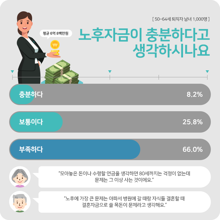 퇴직과 동시에 노후준비도 마쳤다면 걱정 하나 없을텐데, 현실은 그처럼 녹록하지 않습니다. 100년 행복연구센터가 생애 주된 직장에서 물러난 50~64세 남녀 도시생활자에게 노후준비 현황을 물어본 결과, 8.2%만이 노후자금이 충분하다고 답했고, 아쉽게도 3명중 2명(66.0%)은 부족하다고 보았습니다.