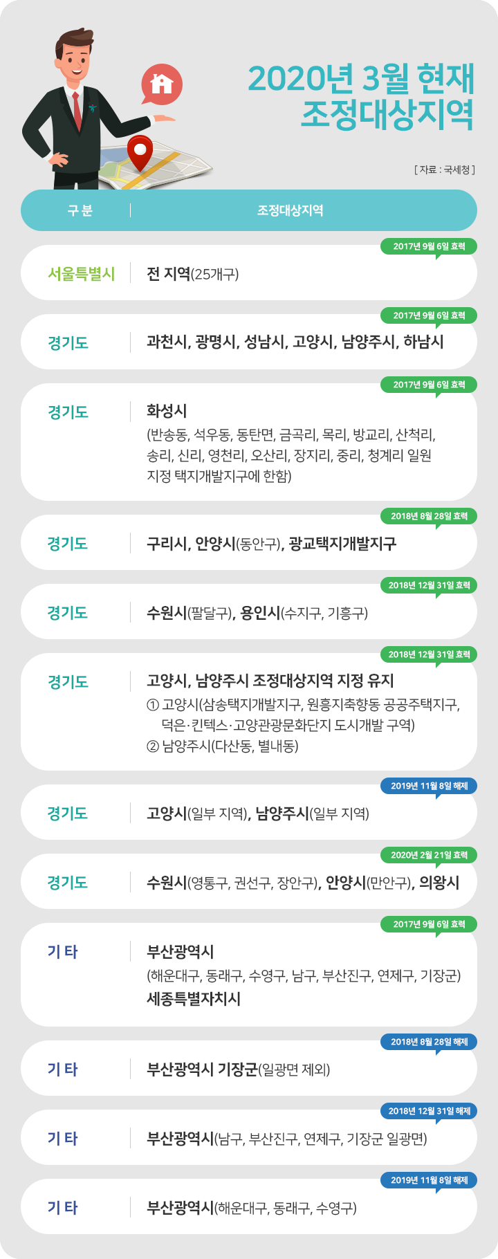 조정지역은 매년 조금씩 변경이 됩니다. 양도일 현재는 조정지역이 아니더라도 취득일 현재 기준으로 조정지역이라면 2년 이상 거주가 필요합니다. 예를 들어 부산광역시 해운대구의 경우 2017년 9월 6일 조정지역으로 고시되었지만 현재는 조정지역이 아닙니다. 하지만 취득 당시 조정지역으로 양도일 현재 조정지역이 아니더라도 비과세 혜택을 받으려면 2년 이상 거주를 해야 합니다.