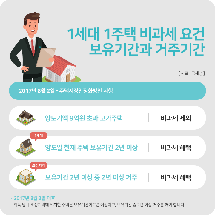 1세대가 양도일 현재 국내에 하나의 주택(양도가액 9억 원 초과인 고가주택은 제외)만을 보유하고 있는 경우로서 당해 주택의 보유기간이 2년 이상인 경우에는 양도소득세가 과세되지 않습니다. 다만, 2017년 8월 2일 ‘주택시장안정화방안’에 따른 조치로 2017년 8월 3일 이후 취득 당시 조정지역에 위치한 주택은 보유기간이 2년 이상이고, 보유기간 중 2년 이상 거주를 해야 합니다.