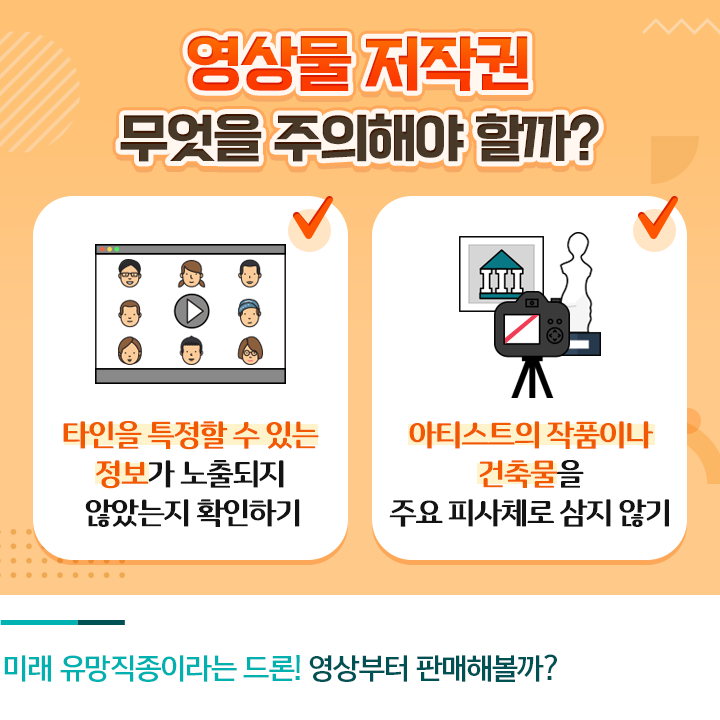 드론 촬영을 시작했다면 관련 플랫폼에 아티스트로 등록한 뒤 간단히 편집한 영상을 올리고, 검색 키워드와 가격을 책정해 주면 됩니다. 이 때 주의해야 할 점은 타인의 초상권이나 재산권을 침해하지 않는지 영상을 꼼꼼히 확인해야 한다는 부분인데요. 예를 들어 타인을 특정할 수 있는 정보나 아티스트의 예술품이나 건축물이 주 피사체가 되면 문제가 될 수 있습니다.