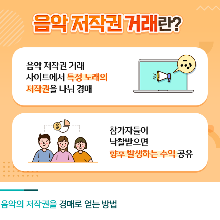 음악 저작권 거래 플랫폼은 침체된 음악시장에 활기를 북돋아주고, 팬이 아티스트에 대한 사랑과 지원을 표할 수 있는 도구의 기능을 수행하고 있는데요. 앞으로도 재능 있는 아티스트들이 여유 있는 환경에서 훌륭한 저작물을 생산할 수 있도록 지원하는 저작권 거래 문화가 점차 확대될 것 같습니다.