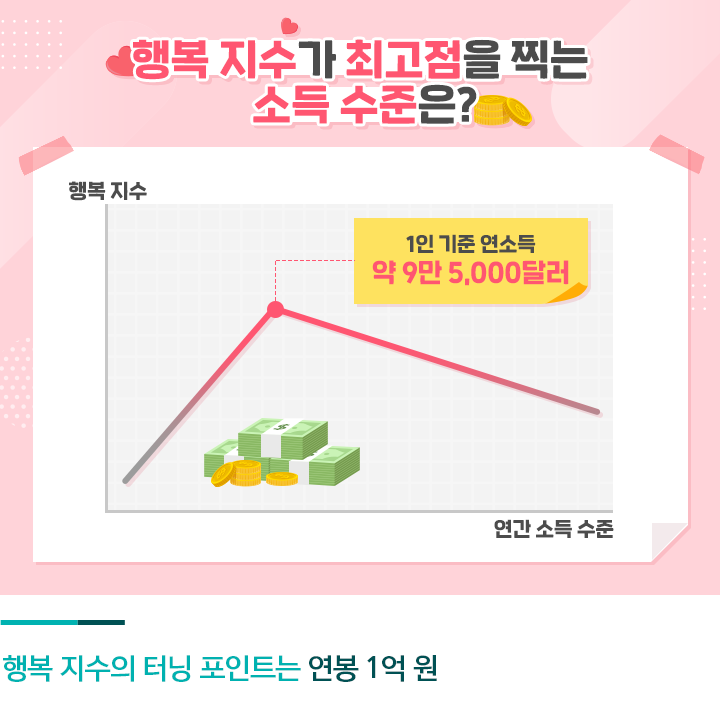 전 세계적으로 평균을 내보면 1인 기준 연 소득이 약 9만 5,000달러(한화 약 1억 원)일 때 행복 지수가 최고점을 찍는 것으로 나타났는데요. 소득이 9만 5,000달러를 초과할 경우 오히려 삶에 대한 행복 지수가 떨어진다는 결과가 나왔습니다.