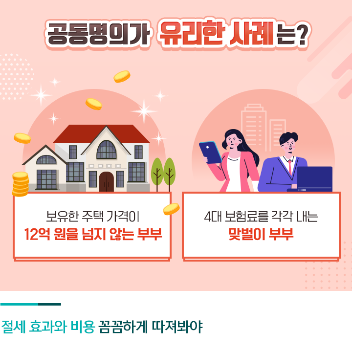 일반적으로 보유한 주택 가격이 12억 원을 넘지 않고 4대보험료를 각각 내는 맞벌이 부부라면 공동명의가 유리하다고 생각하면 되는데요. 앞서 설명한 것처럼 12억 원 이상의 고액 부동산을 취득하는 경우라면 증여 과정에서 세금이 발생할 수 있고, 한쪽 배우자가 4대보험에 가입하지 않은 외벌이 가정이라면 보험료 부담이 크게 증가할 수 있으니 신중하게 결정하는 것이 좋습니다.