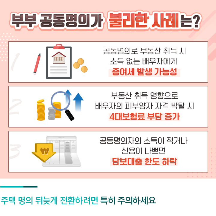 단독명의로 집을 구입한 후 도중에 공동명의로 전환할 예정이라면 특히 주의해야 하는데요. 부동산은 취득·보유·양도 단계마다 세금을 내야 하는데, 최초 취득 시점과 공동명의 전환 시점에서 각각 두 번의 취득세가 발생하기 때문입니다. 만약 공동명의자의 소득이 적거나 신용이 좋지 않다면 담보대출 한도가 낮아질 수 있다는 점도 공동명의의 단점입니다.
