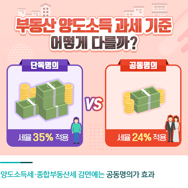 공동명의를 선택할 경우 우선 양도소득세를 크게 줄일 수 있는데요. 양도소득세는 부부 각자의 양도차익에 대해 세금을 계산한 뒤, 양도차익이 클수록 높은 세율을 적용합니다. 예를 들어 양도소득 금액이 1억 원일 때 단독 명의라면 35%의 세율을 적용 받는 반면, 공동명의일 경우에는 이보다 낮은 24%의 세율을 적용 받습니다.