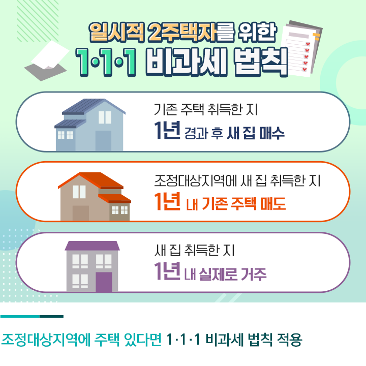 이미 주택을 1채 보유한 상황에서 조정대상지역에 새 주택을 마련하는 분들이라면 ‘1·1·1 비과세 법칙’을 기억해두는 게 좋은데요. 새 집으로 옮기기 위해 일시적으로 2주택자가 된 사람들을 위한 비과세 규정이라고 할 수 있습니다. 이런 케이스에 해당된다면 기존의 주택을 취득한 지 1년 이상 지난 이후에 새 집을 매수해야 하고, 새 집을 취득한 지 1년 내에 기존 주택은 팔아야 합니다. 또 새로운 집을 마련한 지 1년 안에 실제로 거주까지 해야 하죠.