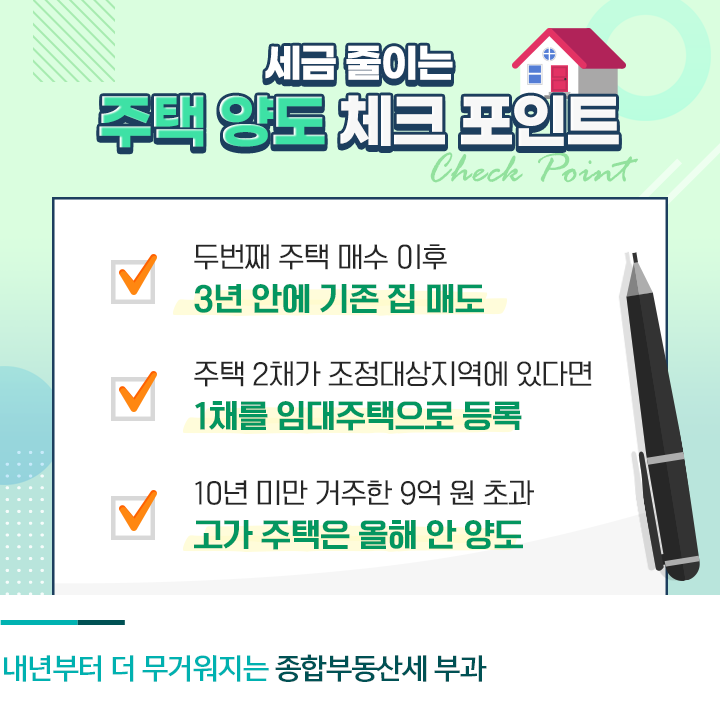 내년부터는 종합부동산세 부과가 더 무거워지는 만큼, 중과세가 예상되는 2주택자는 주택 매각을 통한 양도, 증여 등을 진행하는 것이 유리합니다. 양도 시점도 과세 방식이 변경되는 시점을 고려해야 합니다. 일단 2주택 비과세 조건이 충족되지 않더라도 두 번째 주택을 사고 3년 안에만 기존 집을 매각하면 기존 주택은 중과세 대상에서 벗어납니다.