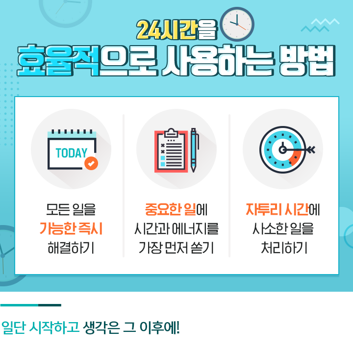 하루 24시간은 누구에게나 똑같이 주어집니다. 시간이 돈이라면, 시간을 낭비하지 않고 효율적으로 사용하는 것이 곧 돈을 버는 방법이라고 할 수 있겠죠. 시간을 생산성 있게 활용하는 가장 좋은 방법은 모든 일을 가능한 즉시 해결하는 것입니다.