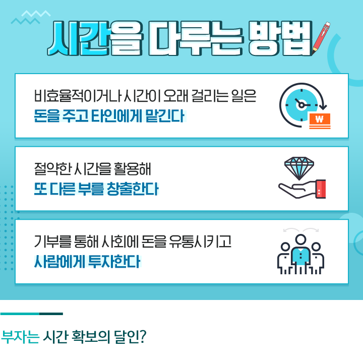 오늘 알려드린 내용이 반드시 부자들에게만 해당되는 것은 아닙니다. 시간은 누구에게나 공평하게 주어지는 만큼 시간 부자가 되는 길은 모두에게 열려 있는데요. 또 하나의 자산인 시간을 잘 활용해 진정한 부를 쌓는 여러분이 되시기를 응원하겠습니다!